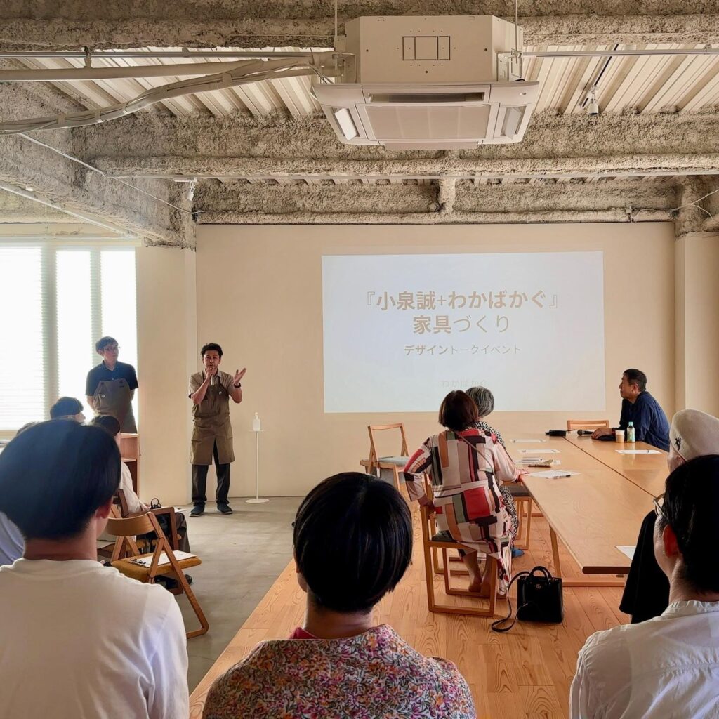 わかばかぐ一階ギャラリーでは「鉄と舎庫とエトセトラ」を開催中。展示会に合わせて毎年恒例のトークイベントを行い沢山の若葉家具ファンの皆さんに集まっていただきました。定例会議では今後の新作・広報・展示会の話。そして福山駅前には石上純也さんの鉄の雲が。
