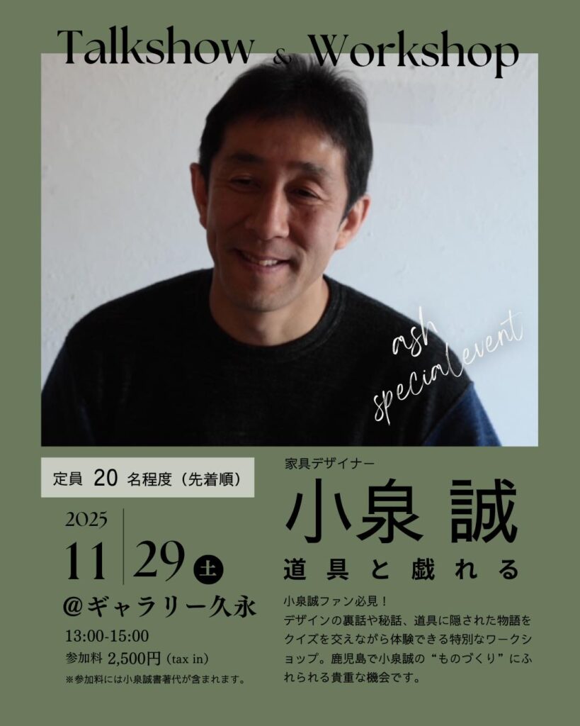 11月22日から12月7日まで鹿児島で行われるash design&craft fair 2025に参加します。ギャラリー久永さんで「小泉誠×わかばかぐ」の展示を行い下記のワークショップを行いますのでぜひご参加ください。