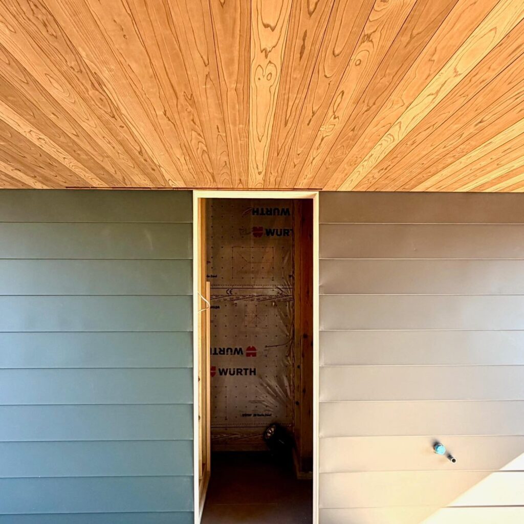 浅間山を眺めて群馬の現場。ほしかわ工務店の社屋+お店もあと3ヶ月で完成。ブビンガのテーブル•ポストの色•手摺の納まり•椅子の色決めなど細かな検証。結果的にはどれもカーキ系の「ほしかわ色」になるのが楽しい。