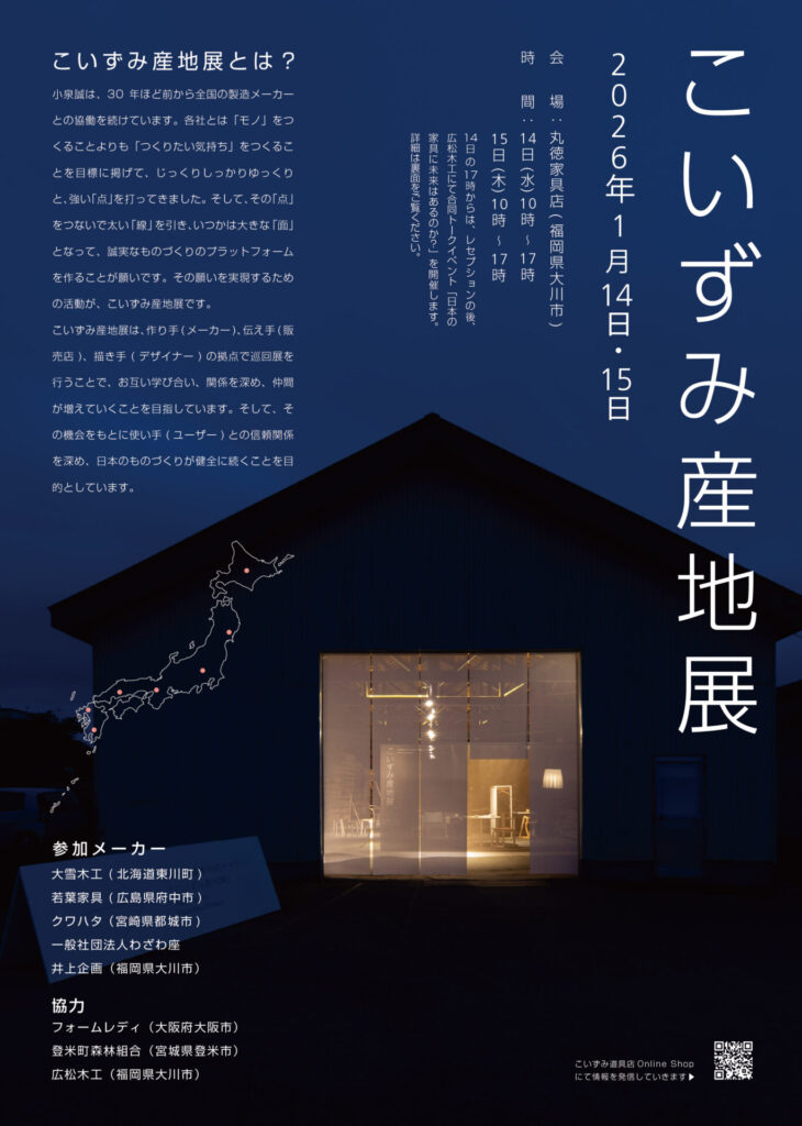 慶応三年創業の丸徳家具店は、福岡県大川市で五代目の佐藤夫妻が営む木製椅子の専門店です。小泉誠とは2003 年に椅子づくりの現場で出会い、お互いかけがえのない仲間となり、2016 年には店舗の設計を小泉に委ねています。今回の展示では店内の家具を一掃して、全ての空間を「こいずみ産地展」の家具のみで新たな空間構成を行います。また、普段は公開していない屋根裏部屋「杉の間」でも特別展示を行います。